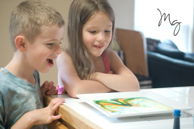This summer we are learning about the fifty states and the continents. I will post more on that project later. we also added in some art and science projects too. On this day we did an experiment with milk. You add a few drops of food coloring spaced out and nothing really happens. Then you drop a few drops of good dish soap and the magic begins. The soap reacts the the fat in the milk and it starts swirling and moving the colors all around. I t would have looked way cooler if I had more colors then just yellow, blue and green :) We joked that it was a tribute to the Timbers.